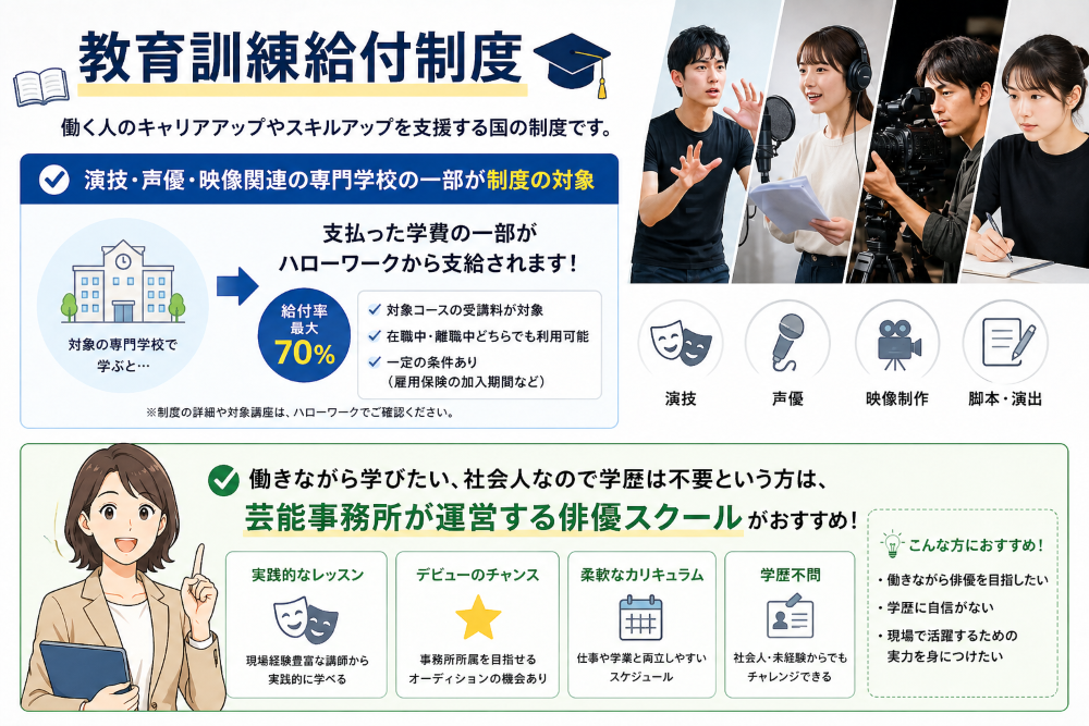 どうしても仕事との両立に不安を感じる場合は、夜間コースやオンラインレッスンが受けられる俳優スクールを選びましょう。