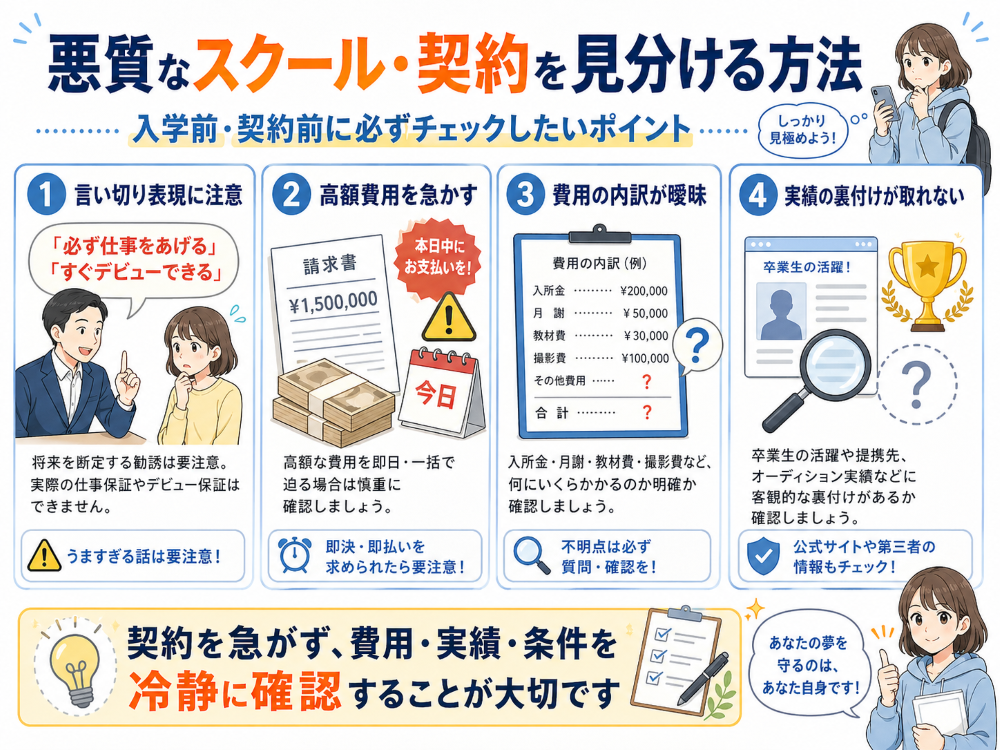 俳優スクールを選ぶ際、以下のポイントを判断基準として考えると良いでしょう。