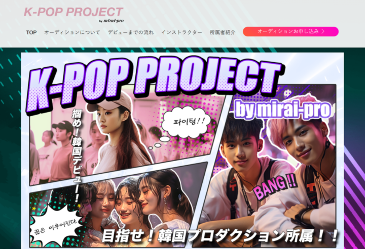 韓国の芸能プロダクション入りをバックアップして欲しいなら、K-POP PROJECT by mirai-proの入所オーディションに挑戦してみてはいかがでしょうか。